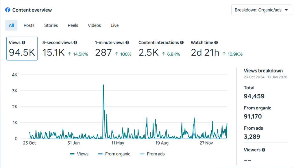 Using Meta Business Suite insights from 23 October 2024 to 13 January 2026, Kaimai experienced significant growth across all key metrics.