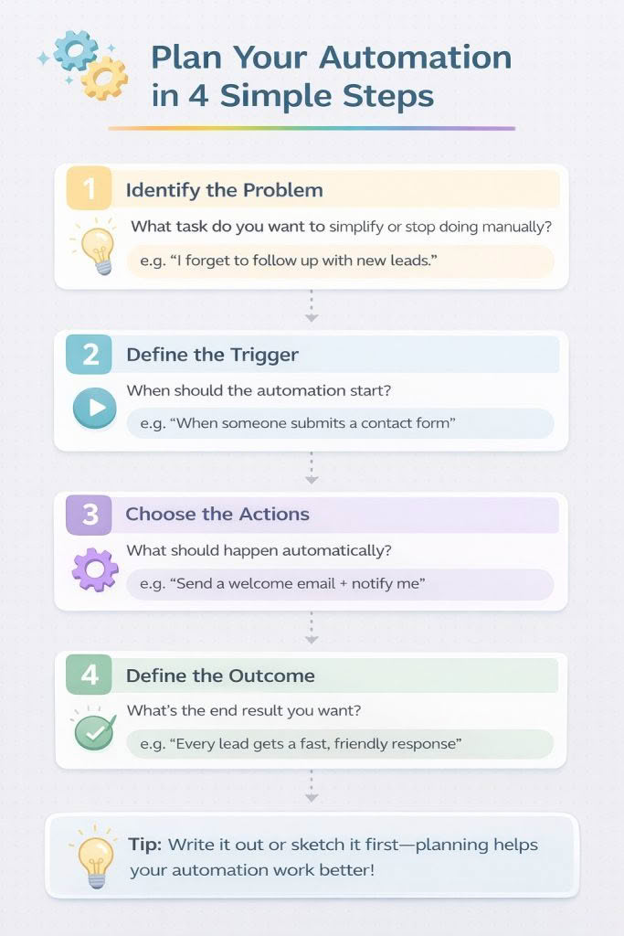 This simple framework helps plan automations before anything is built. Identify the problem first, then define the trigger, actions, and outcome.