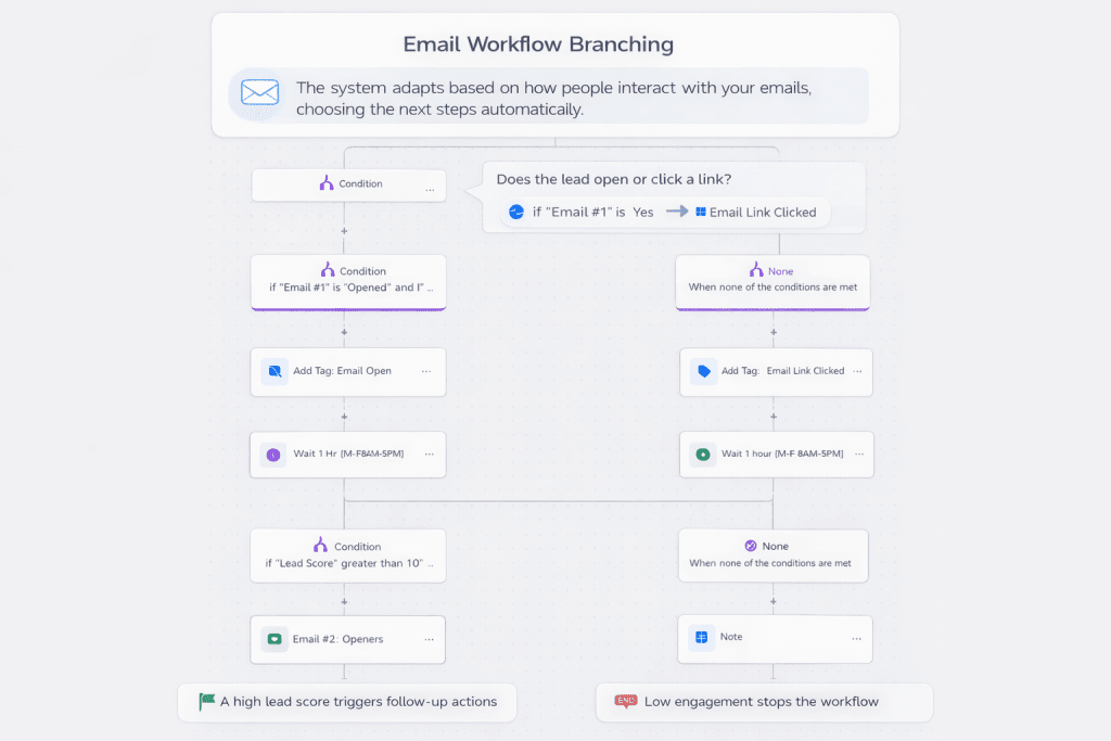 This image shows how email workflows adapt based on behaviour. The system checks whether an email was opened or clicked and then chooses the next steps automatically, such as sending follow-ups, updating lead scores, or stopping the workflow entirely.
